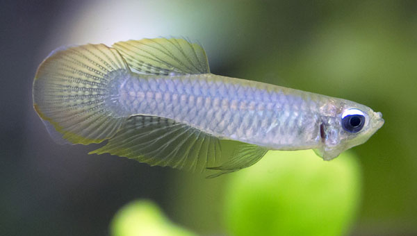 Es una especie procedente de África. Su hábitat natural son los pequeños ríos, arroyos y riachuelos. Se adaptan perfectamente a condiciones cambiantes de dureza y ph. Su temperatura ideal está entre los 24 y los 26ºC. Alcanza una longitud de 4,5 cm (la hembra es un poco más pequeña). Es alargado y fusiforme. Presenta un color azul grisáceo con los bordes oscuros. Tanto machos como hembras destacan por un reflejo azul en el ojo (de ahí su nombre común). Es una especie de fácil mantenimiento y convive perfectamente con otros peces pequeños y con gambas
